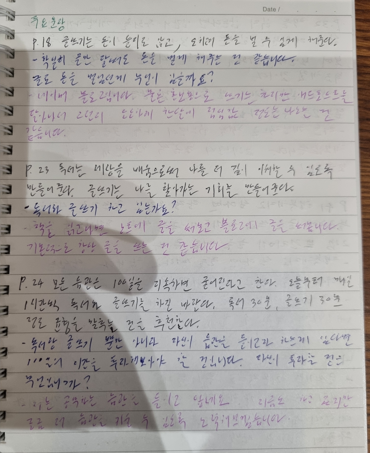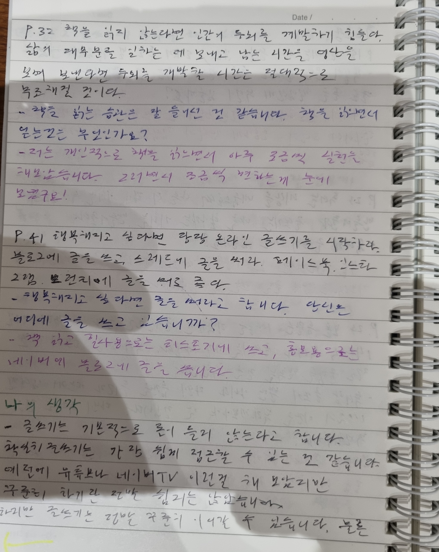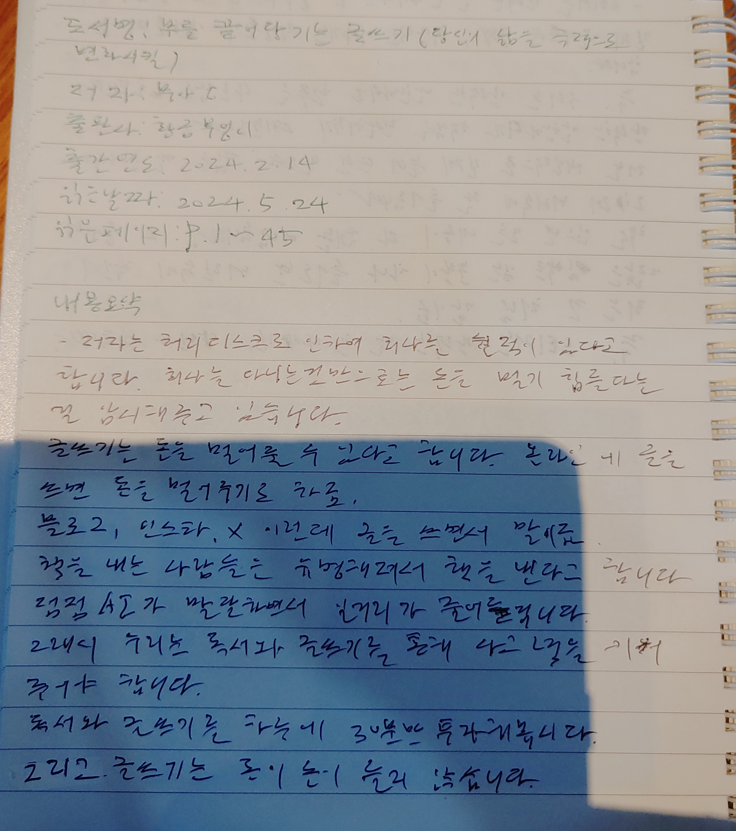 - 책을 읽고 나면 노트에 글을 써보고 블로그에 글을 써봅니다. 기본적으로 항상 글을 쓰는 것 같습니다.