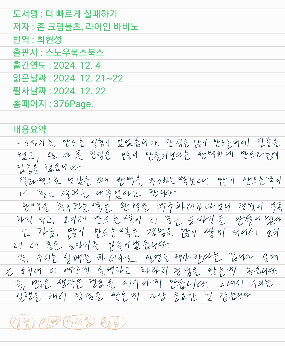 즉, 우리는 실패를 하더라도 실행을 해야 한다는 겁니다. 실패는 오히려 더 빠르게 실패하고 차라리 경험을 쌓는 게 좋습니다.