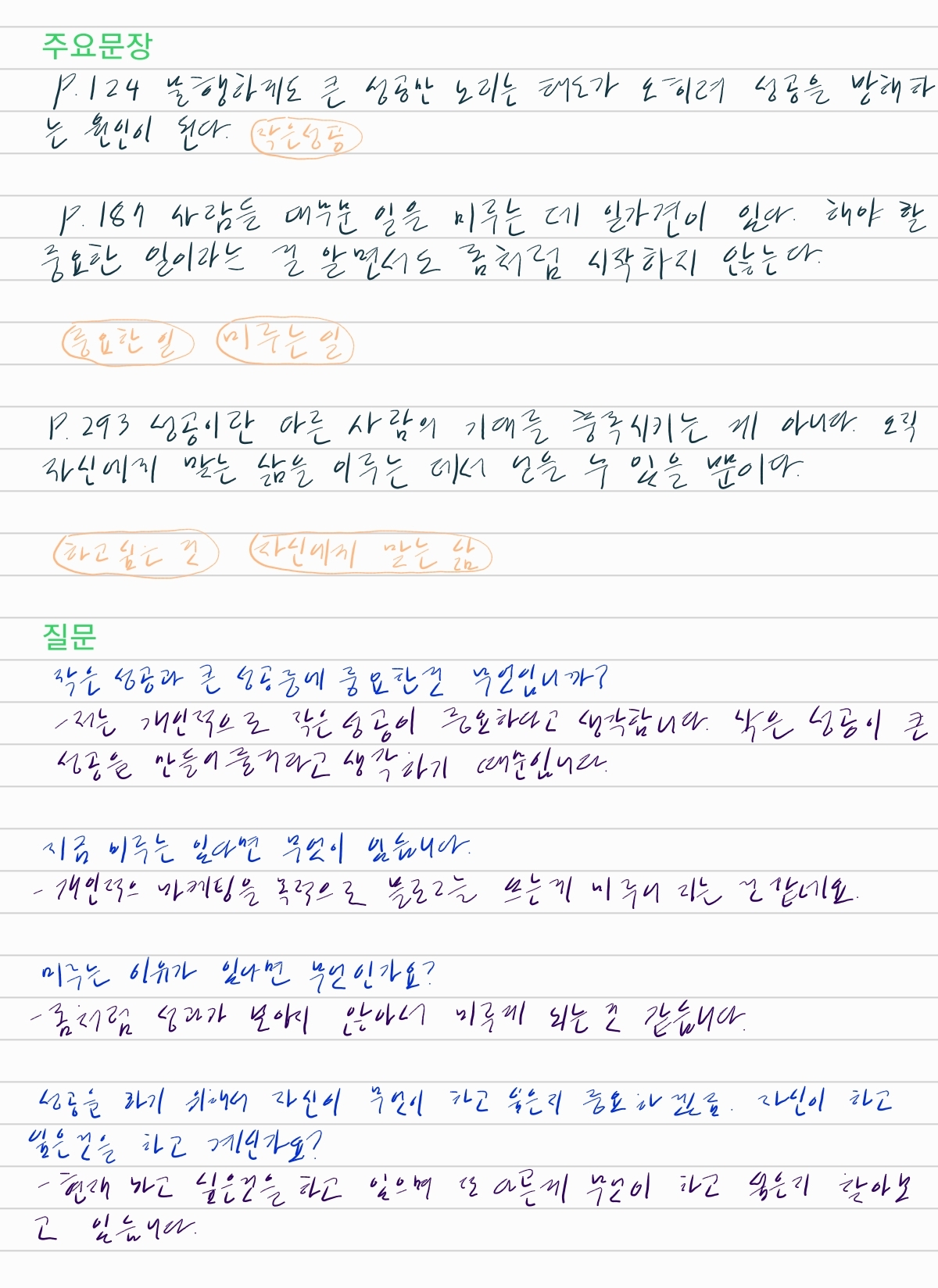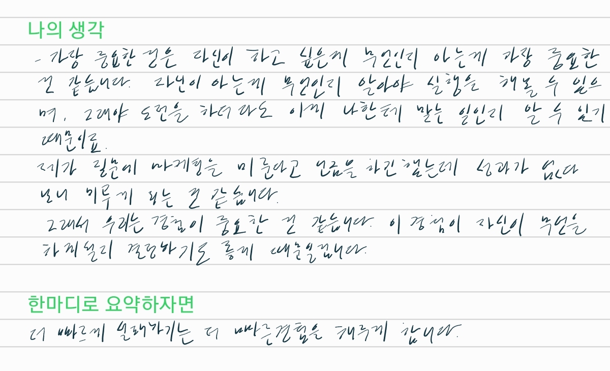 - 저는 개인적으로 작은 성공이 중요하다고 생각합니다. 작은 성공이 이루어져야 큰 성공도 이루어질 거라고 생각하기 때문입니다.