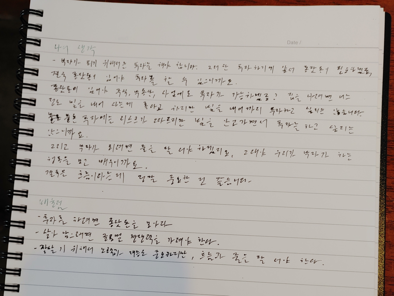 - 봉곡동 카페에서 지인분이랑 같이 앉아서 책을 읽은적이 있는데 필사를 항상 하기 위해서 가방에 있는거 다 끝내니까 저 보고 심심하지는 않겠다고 이야기 하더군요, 이제는 읽고 쓰는게 하나의 루틴이 되었다고 말하더군요.