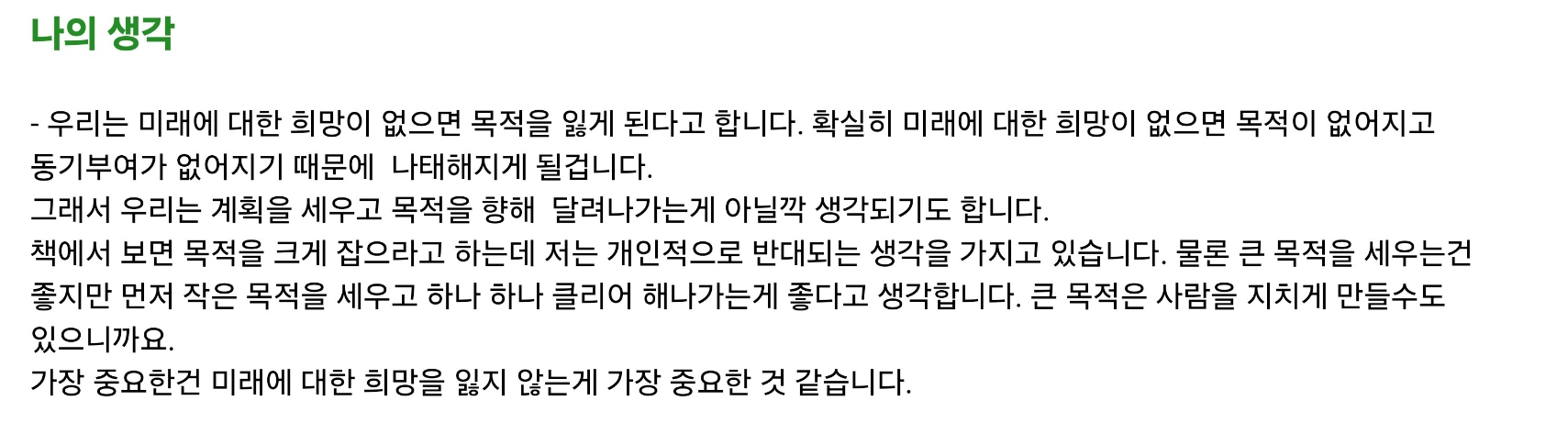 - 우리는 미래에 대한 희망이 없으면 목적을 잃게 된다고 합니다. 확실히 미래에 대한 희망이 없으면 목적이 없어지고 동기부여가 없어지기 때문에  나태해지게 될 겁니다.