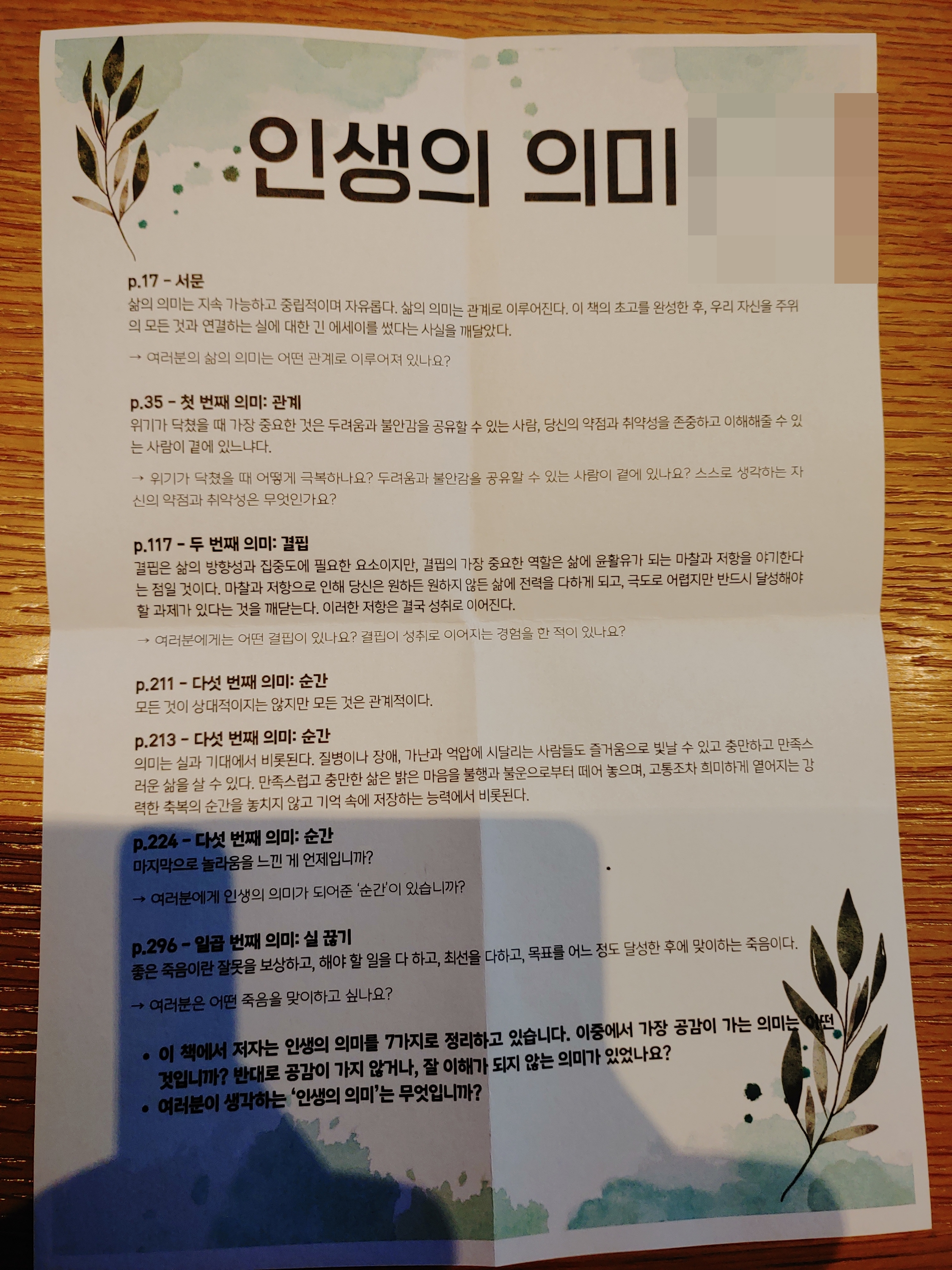 - 2024년 마지막 정모로 책을 읽게 되었습니다. 책을 3번 정도 정독을 했는데 내용들이 스쳐지나가는 느낌이었습니다. 읽으면 까멱는 느낌 저는 솔직히 책에서 인생의 의미를 찾기보다는 이번 독서모임에 참여하면서 발제문을 통해 서로 질문하고 답을 하는 과정에서 인생의 더 찾게 되는 것 같네요.